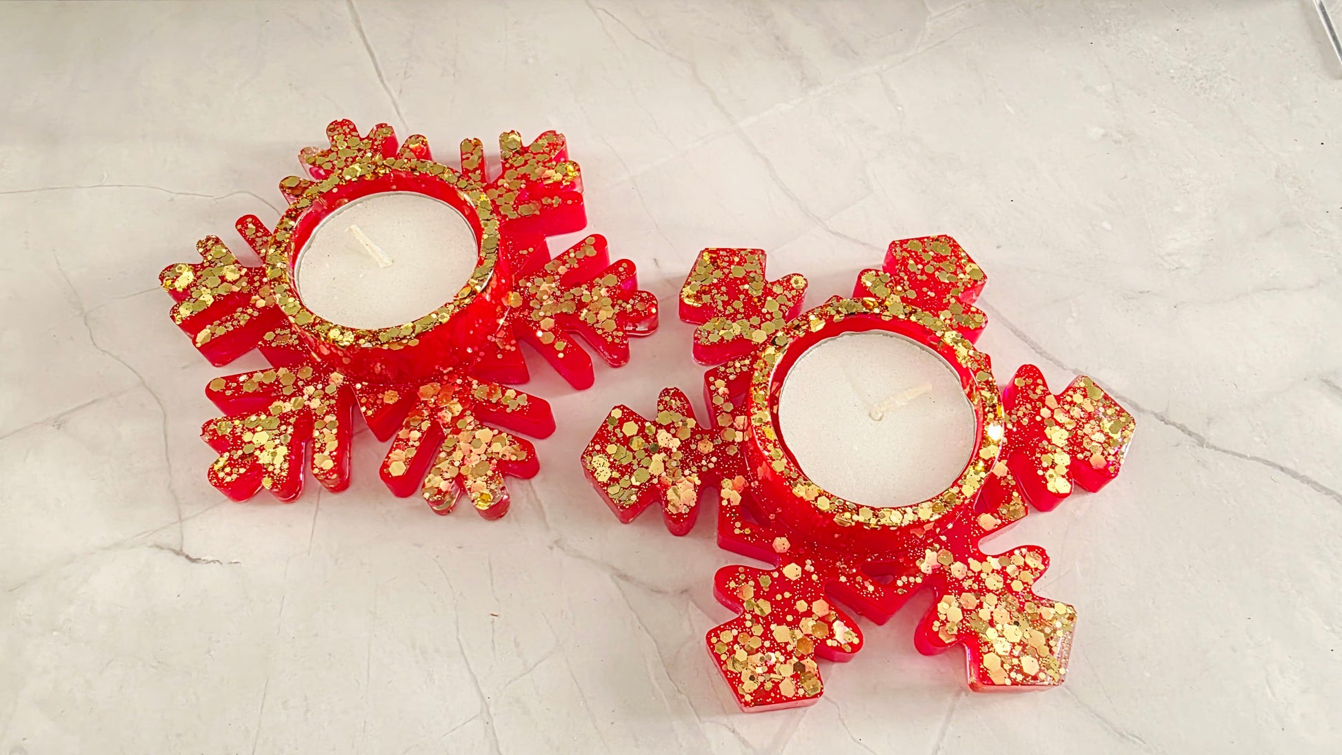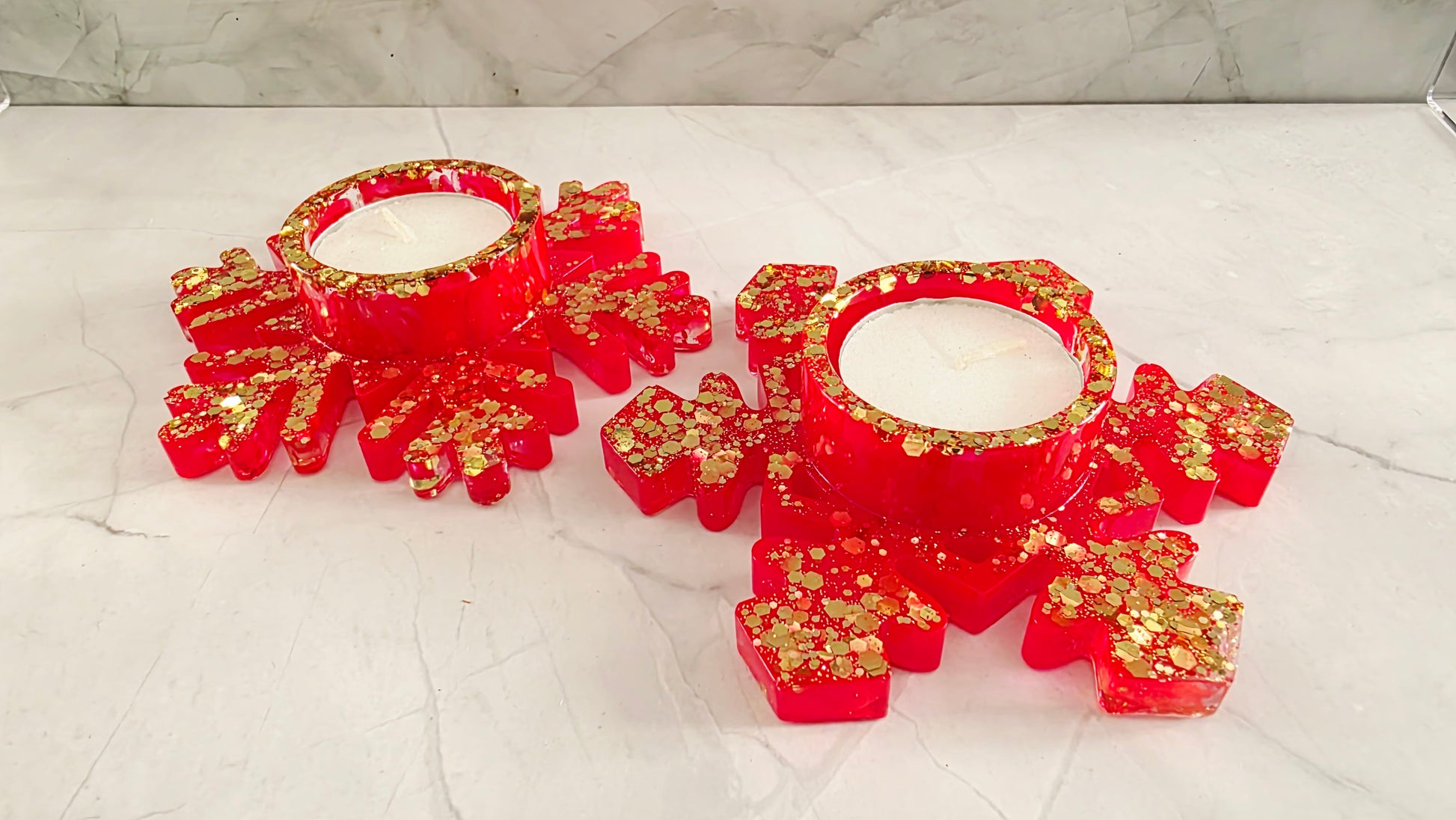 Apportez une touche de couleur a votre table ou à votre intérieur avec ces 2 jolies portes bougies en forme de flocon de noël rouge et or en résine.