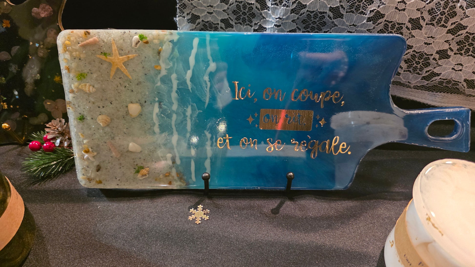 Invitez un air de vacances dans votre cuisine avec cette planche à découper en résine inspirée des plages paradisiaques, avec effet vague réaliste, véritable sable naturel et coquillages incrustés.