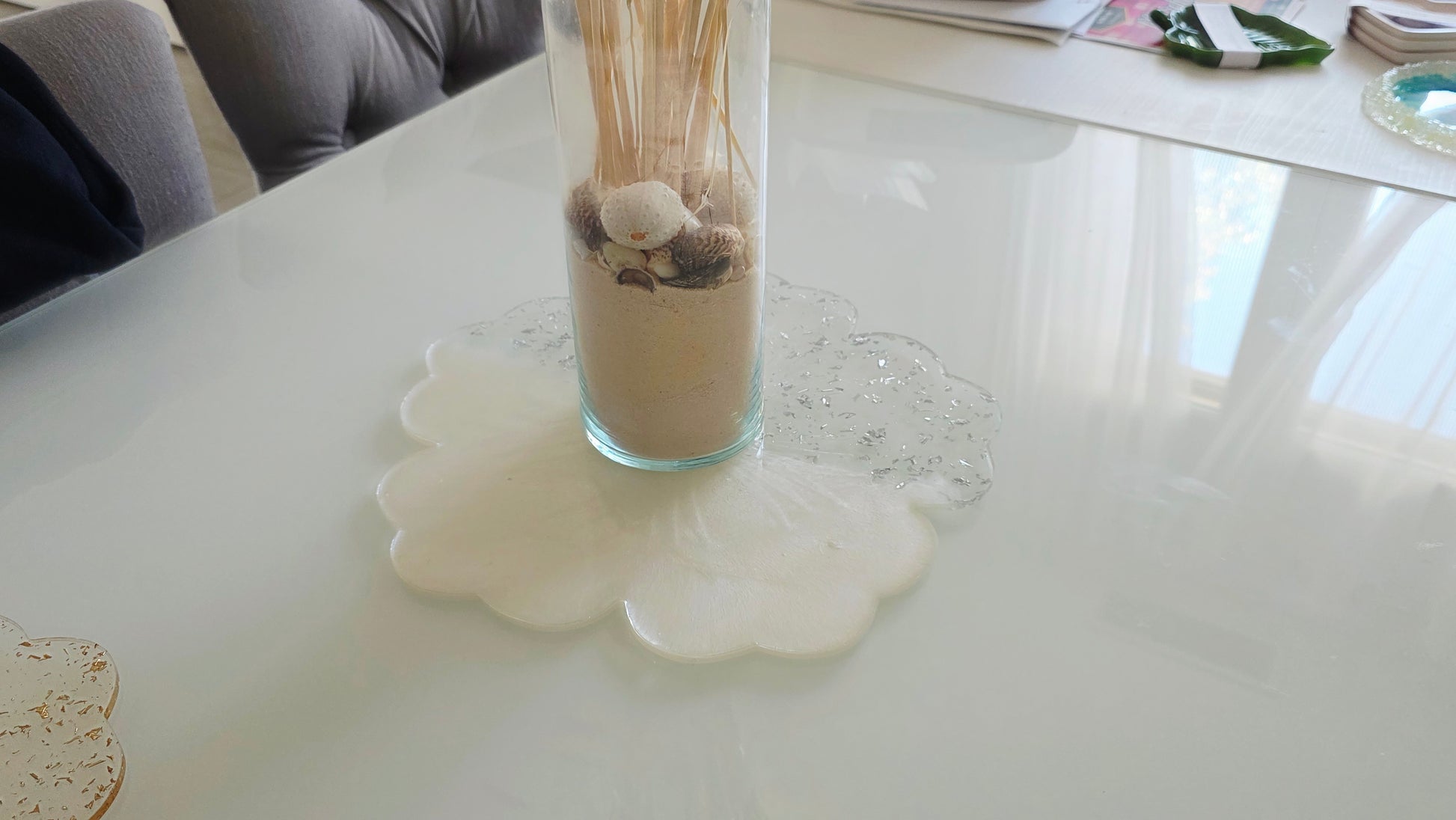 Ce plateau en résine fait main, inspiré d’un pétale délicat, allie la douceur d’un rose poudré à la transparence et aux reflets dorés.