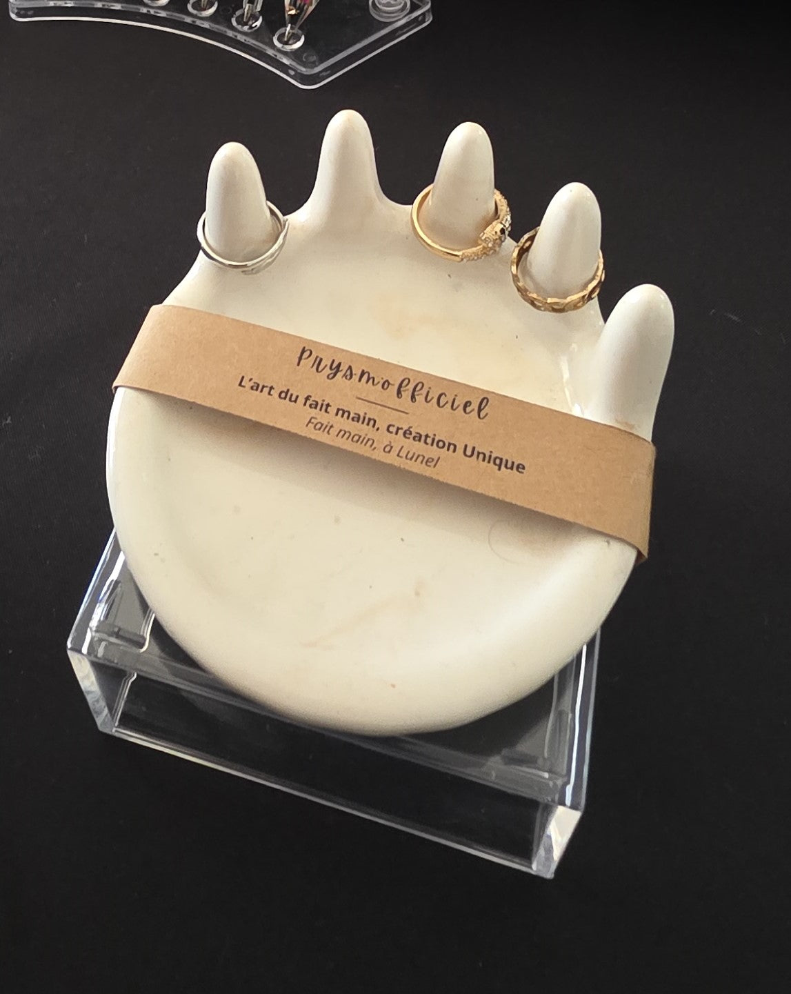Ce repose-bijoux en forme de main est façonné en résine acrylique, avec un effet marbré et des teintes artistiques soigneusement choisies.