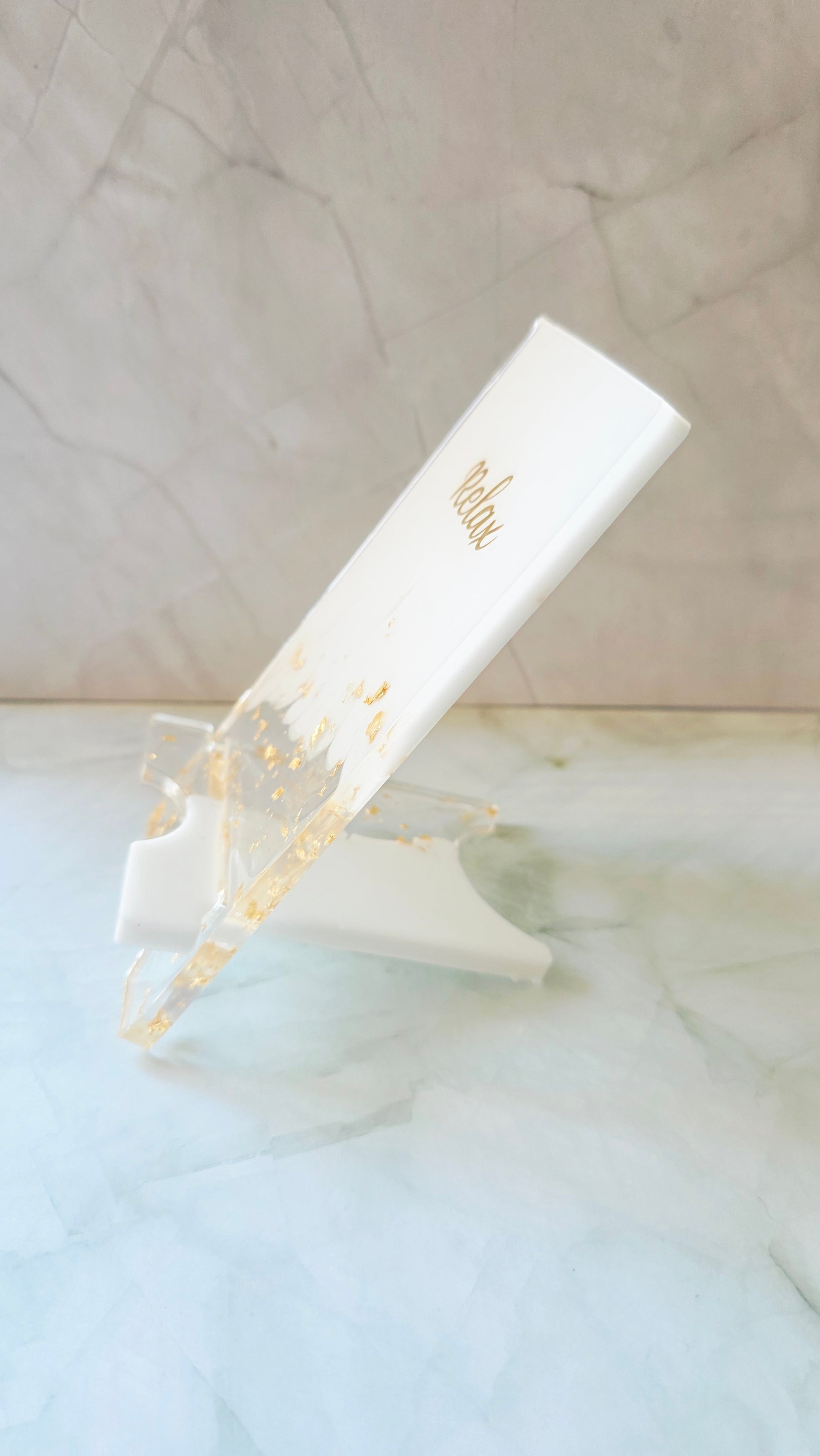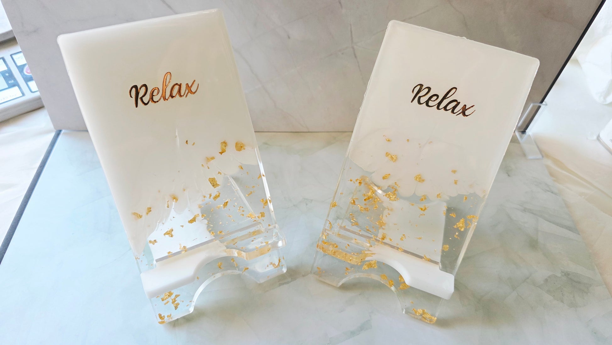 Réalisés en résine transparente et blanche, sublimés par des éclats de feuille d’or et une inscription dorée “Relax” ou un motif zen, ils se déclinent en deux formes :